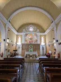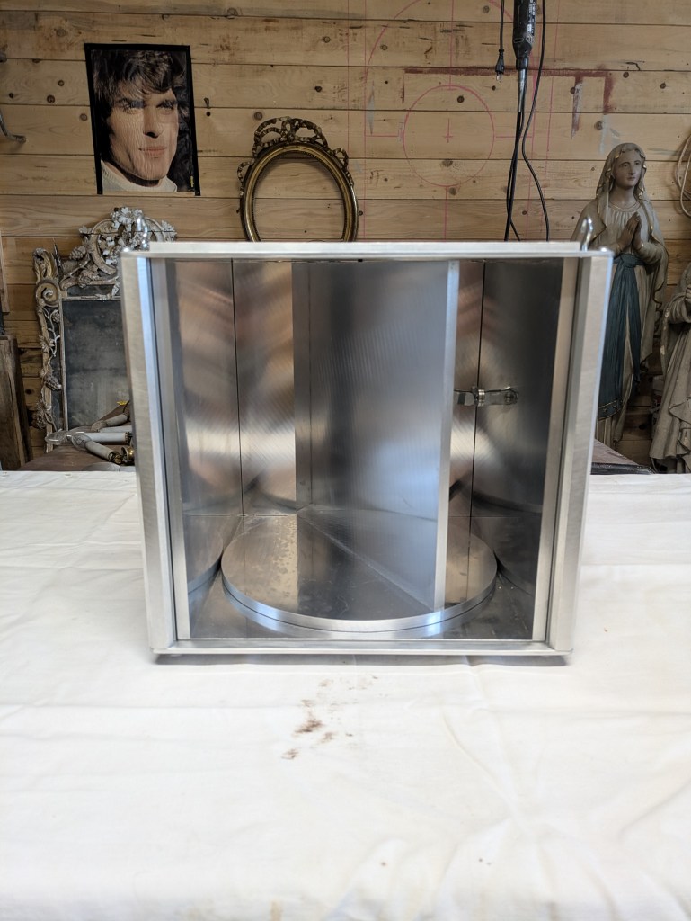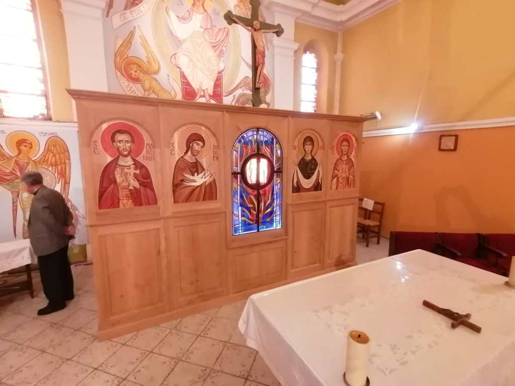 - Vitrail avec ouverture centrale pour l’accès au tabernacle.